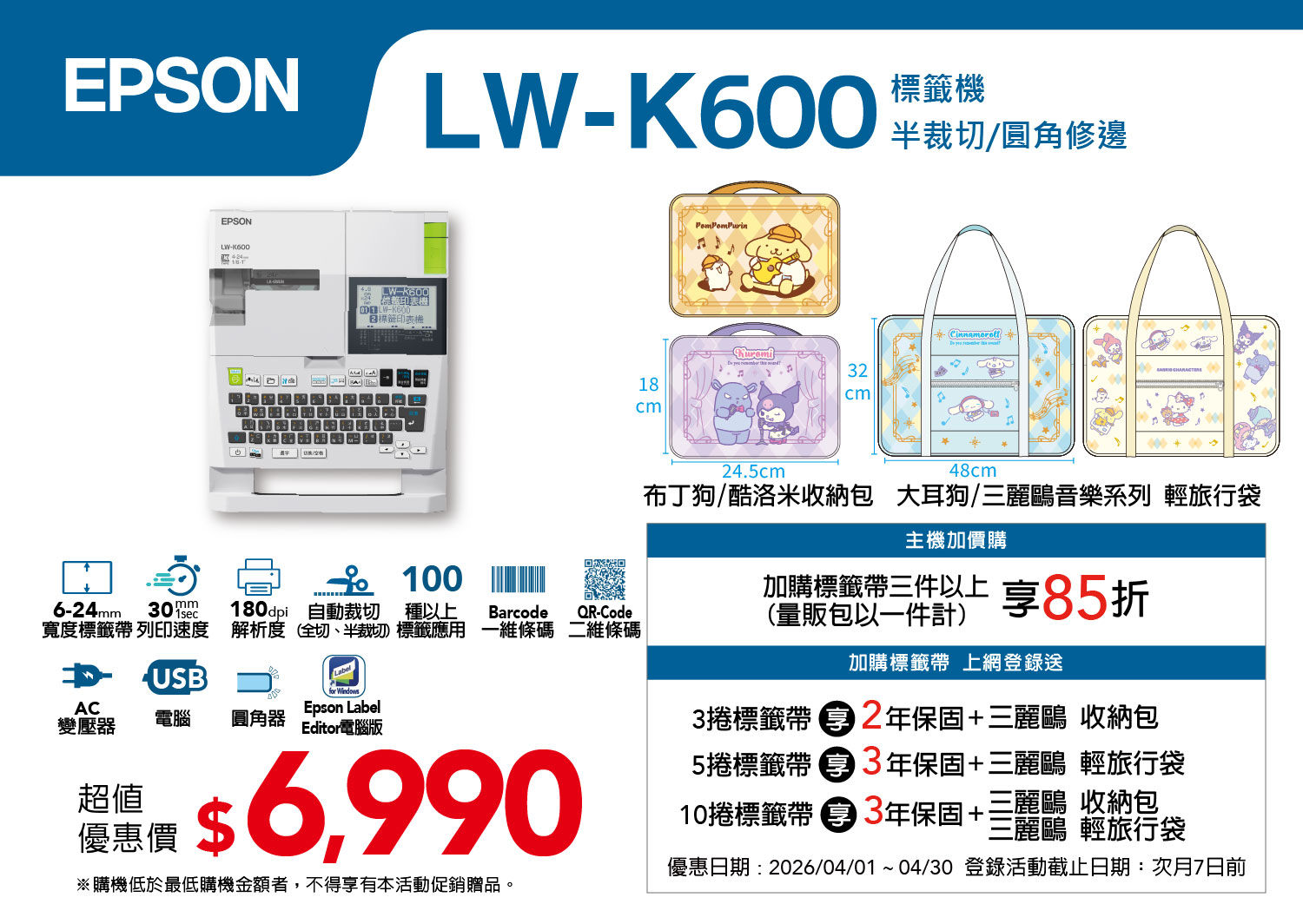 ※ 標籤機及附件耗材,一經拆封,除產品本身有瑕疵,恕無法辦理退貨。
