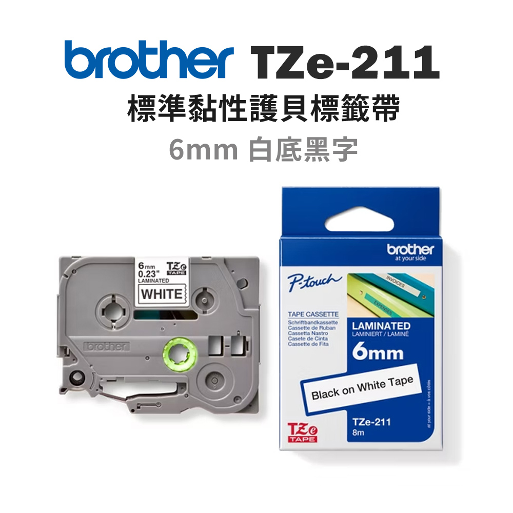 > TZ-211白底黑字6mm護貝標籤帶,有brother 的特殊專利,表面多了一層保護膜。