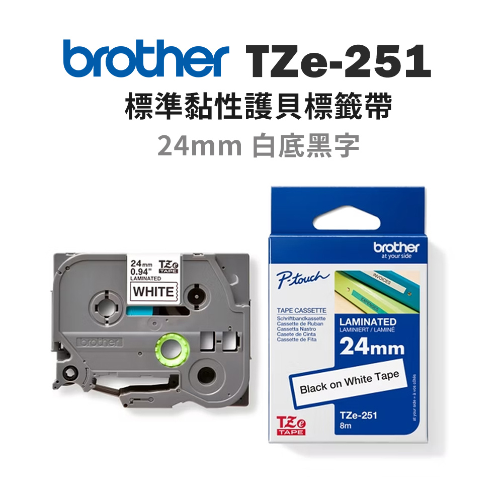> TZ-251白底黑字24mm護貝標籤帶,有brother 的特殊專利,表面多了一層保護膜。