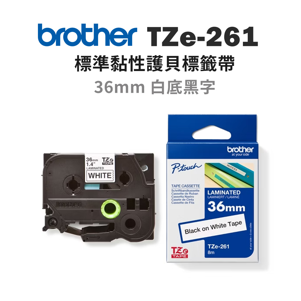 > TZE-261白底黑字36mm護貝標籤帶,有brother 的特殊專利,表面多了一層保護膜。