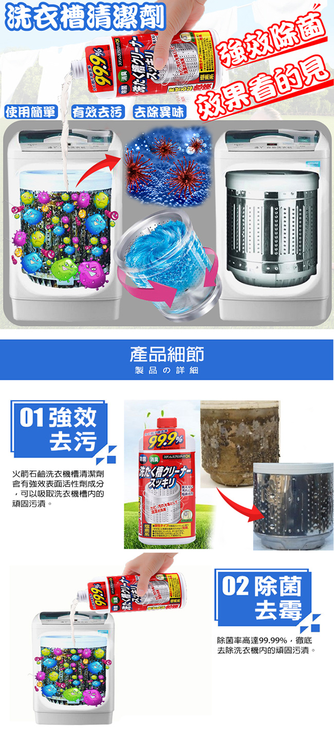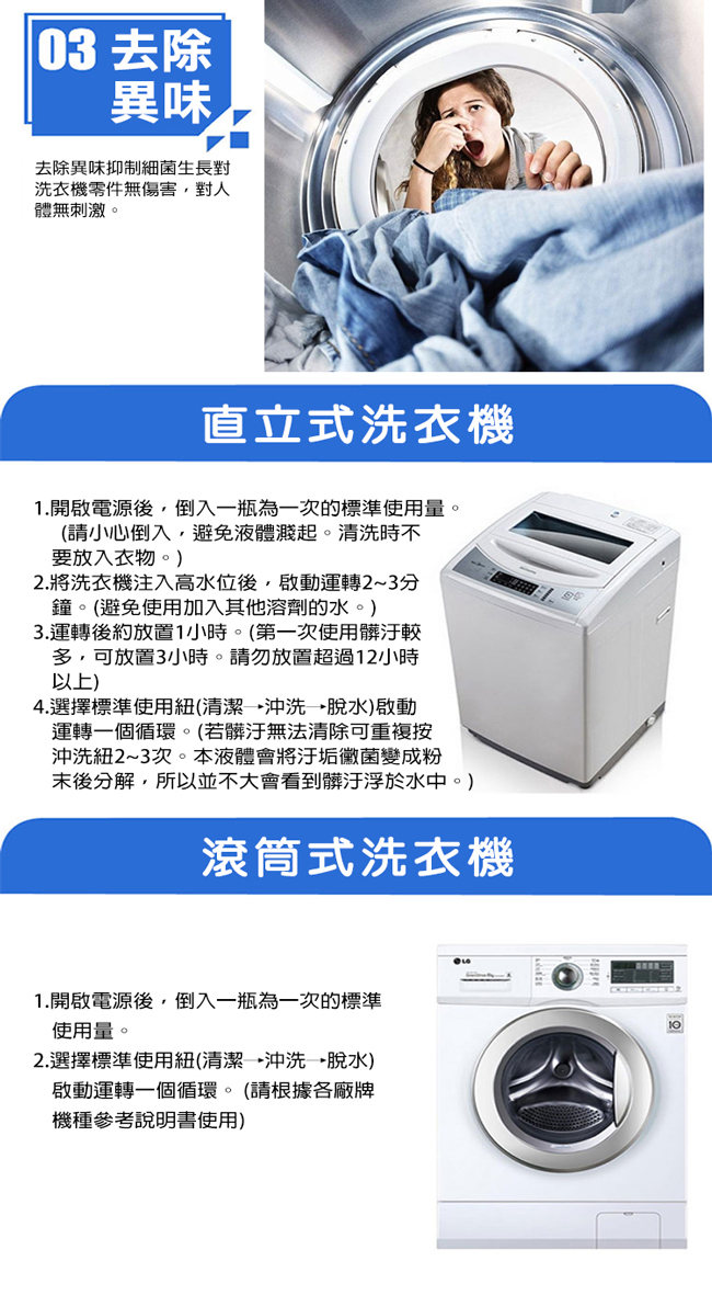 ●除菌率99.9% ●有效洗淨洗衣機夾層內汙垢 ●有效除霉除菌 ●溫和配合 安心使用 ●免除衣物二次污染 產地:日本規格:550g 用途:洗衣機槽除霉除菌、消除髒汙清洗全自動洗衣機槽時的使用方法: 1.開啟電源後,倒入一瓶為一次的標準使用量。 (請小心倒入,避免液體濺起。清洗時不要放入衣物。) 2.將洗衣機注入高水位後,啟動運轉2~3分鐘。(避免使用加入其他溶劑的水。) 3.運轉後約放置1小時。(第一次使用髒汙較多,可放置3小時。請勿放置超過12小時以上) 4.選擇標準使用紐(清潔→沖洗→脫水)啟動運轉一個循環。 (若髒汙無法清除可重複按沖洗紐2~3次。本液體會將汙垢黴菌變成粉末後分解,所以並不大會看到 髒汙浮於水中。) 滾筒式洗衣機的使用方法: 1.開啟電源後,倒入一瓶為一次的標準使用量。 2.選擇標準使用紐(清潔→沖洗→脫水)啟動運轉一個循環。 (請根據各廠牌機種參考說明書使用) 注意事項: ●請勿吞食本商品,不得用於用途以外之物品 ●請避免高溫及陽光直射,存放於陰涼通風處 ●使用後嘴巴發生異常,請停止使用並立即就醫。 ●若原肌膚有傷口、紅腫過敏等現象,或使用後有肌膚不適,請勿使用並立即洽詢皮膚科醫師 ●若不慎誤入眼睛時,不要搓揉眼睛,請立即用水沖洗15分鐘以上,並請立即就醫。 ●由於本品含氯成分,能有效吸附浸透髒汙,達到除霉漂白的效果。 ●本品內含防鏽劑成分,不銹鋼材質水槽使用OK。 ●能徹底達到除臭抗菌的效果,使水槽維持潔淨無異味。 ●洗衣機、除濕機內槽清潔使用OK