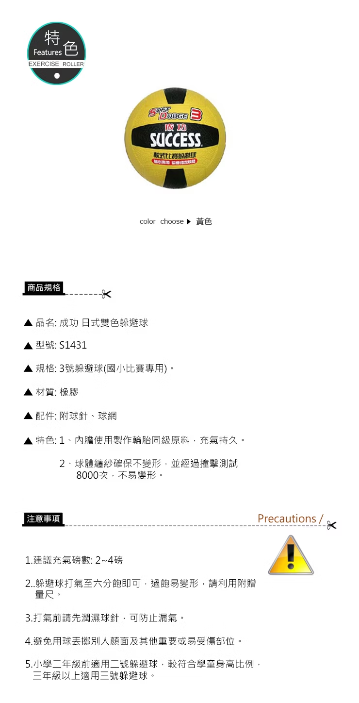 1.躲避球打氣至六分飽即可,過飽易變形,請利用附贈量尺