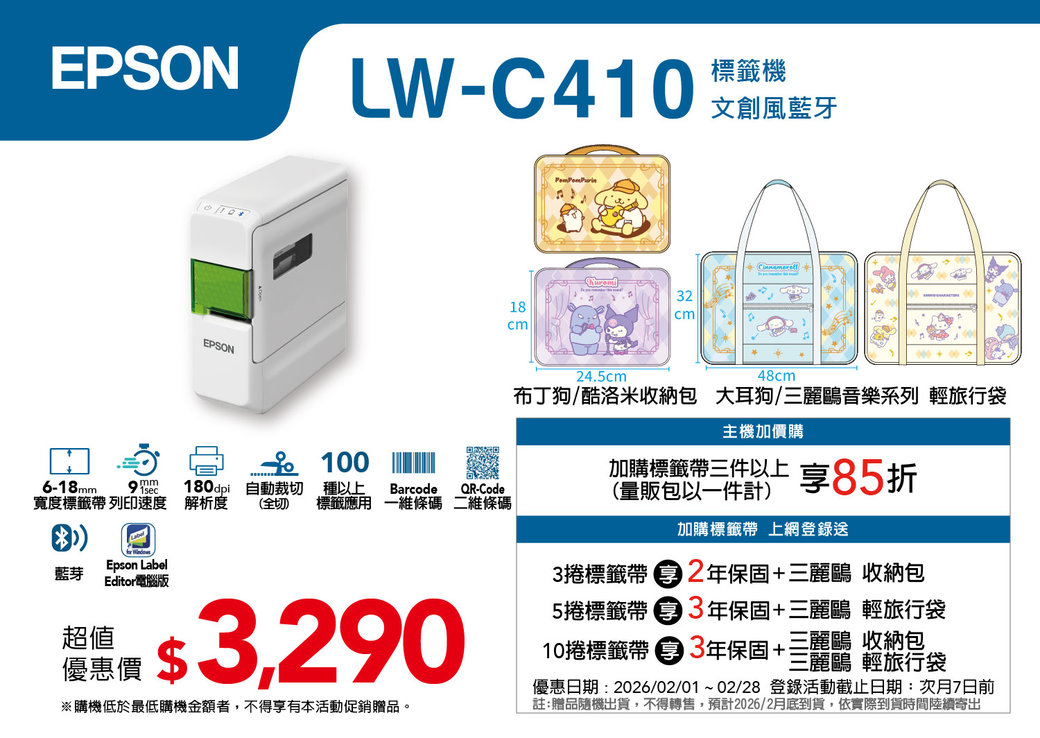 【滿額禮】凡購買『愛普生EPSON』標籤機(帶)全系列商品,單次單筆訂單滿$3000元,即贈:7-11 $100元禮券一張。滿$5000元,即贈:7-11 $100元禮券二張。※(恕不累送,數量有限,送完為止) ※(更多商品請上網選購) |