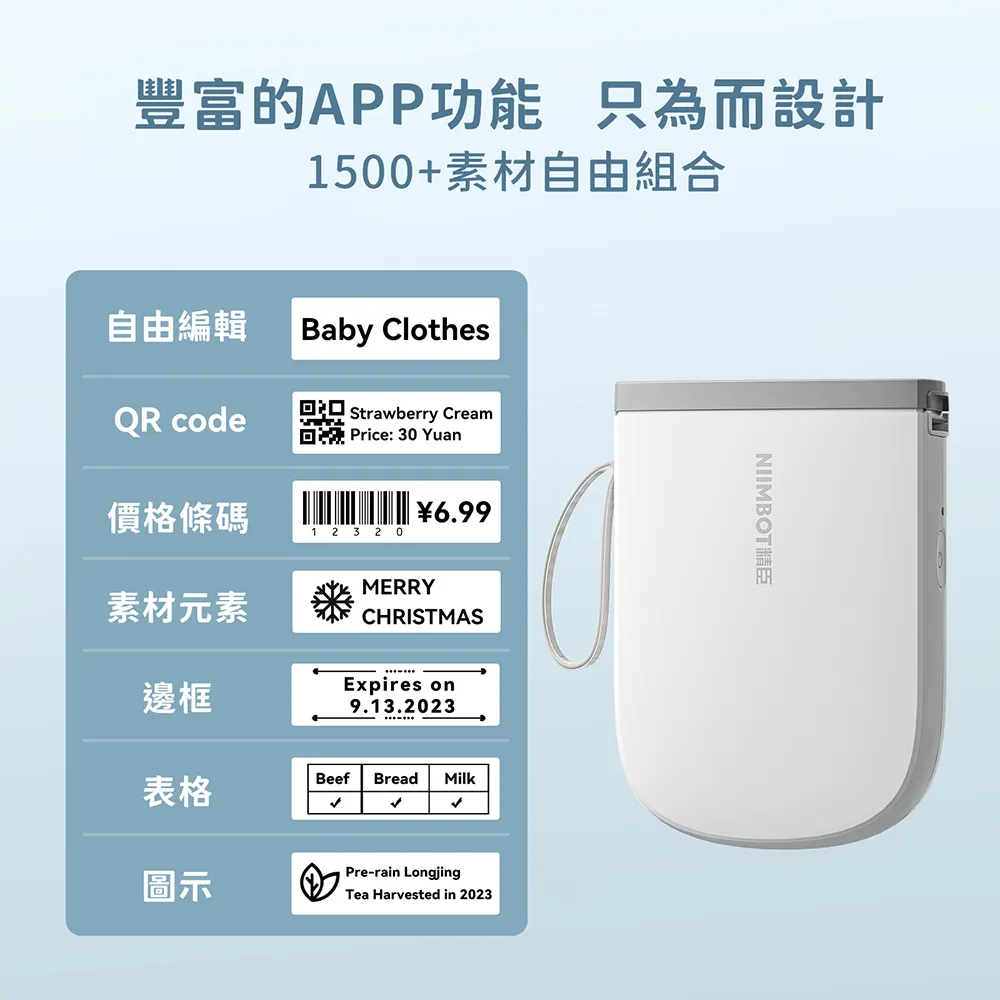 內建圖案、QRCODE、條碼、表格、序號、圖片。