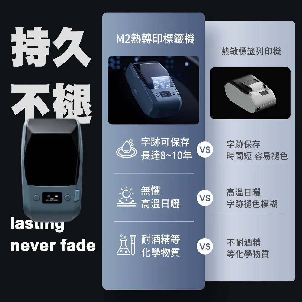 「M2,熱轉印標籤機,高解析度,十年字不退色!」