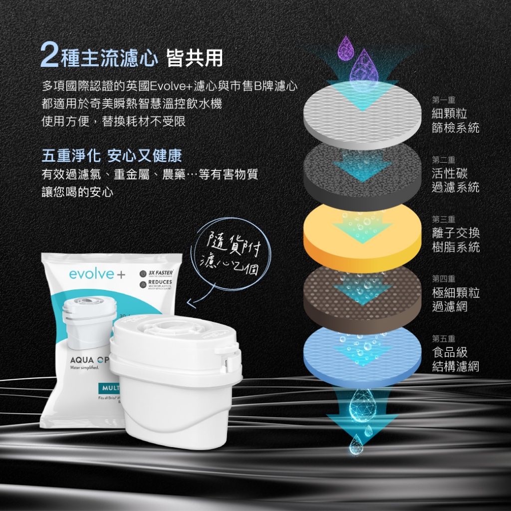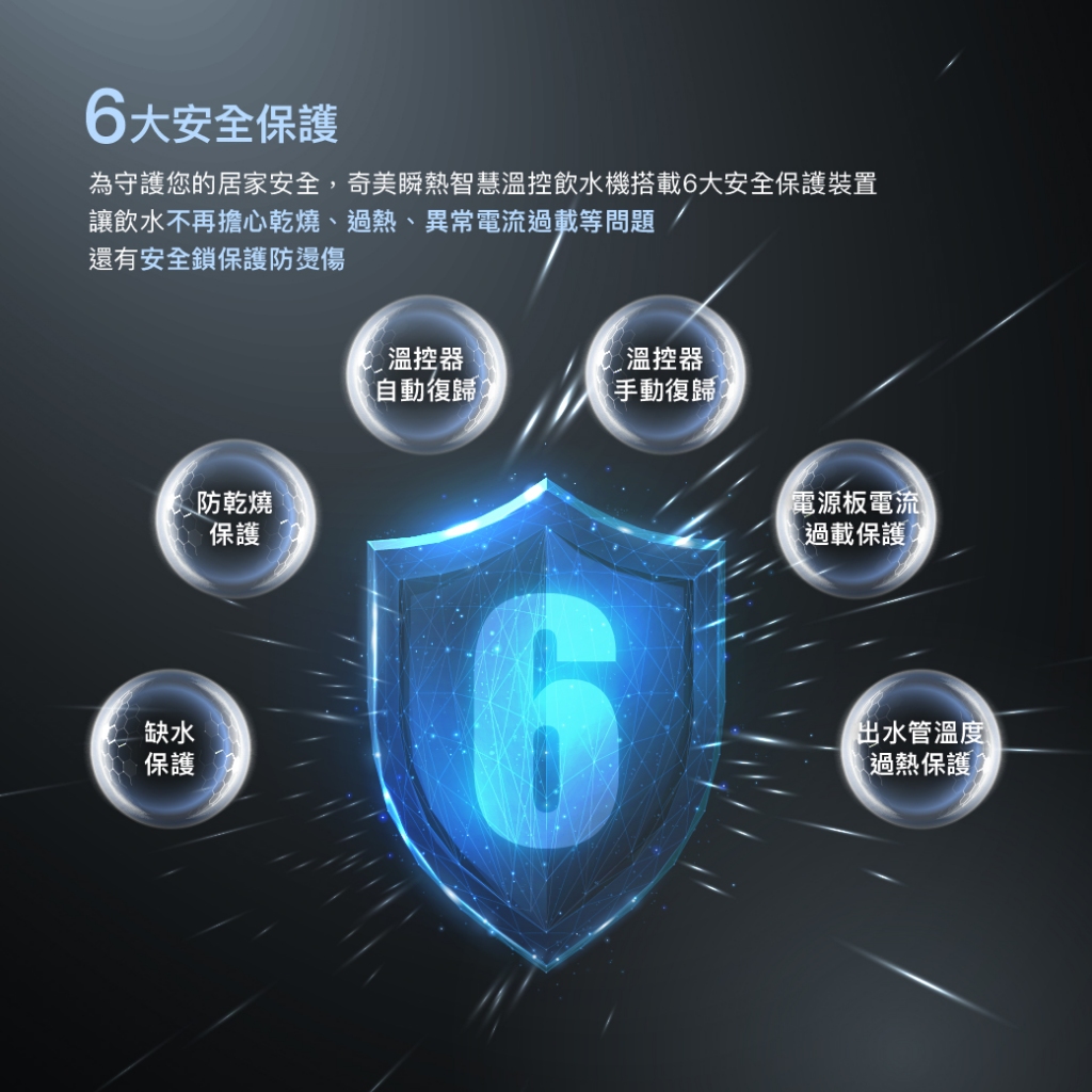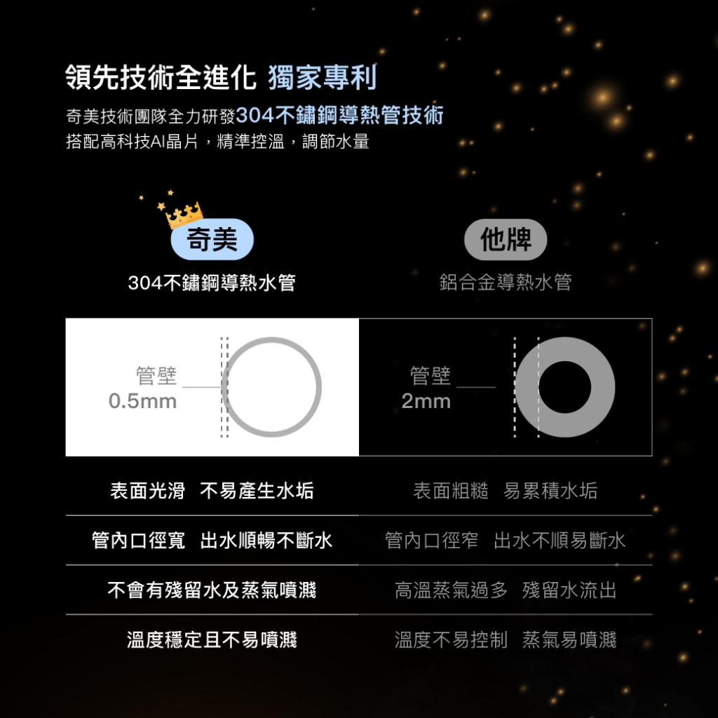 奇美技術團隊『304不鏽鋼導熱管技術』,不鏽鋼材質表面光滑、耐高溫,不易殘留水垢,管壁厚度僅0.5 mm,內管直徑更寬,可避免乾燒,出水順暢,瞬熱更安全,搭配高科技AI晶片,精準控溫,調節水量。