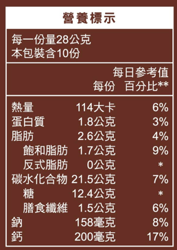麥香鮮奶麥片【小麥粉、小麥麩皮、玉米澱粉、蔗糖、鮮奶、食鹽、卵磷脂、混合濃縮生育醇(抗氧化劑)】、蔗糖、可可燕麥奶(可可粉、燕麥、全脂奶粉)、麥芽糊精、非氫化棕櫚仁油、碳酸鈣、乳清粉、杏仁粒、食鹽、關華豆膠、香料、小麥纖維 |