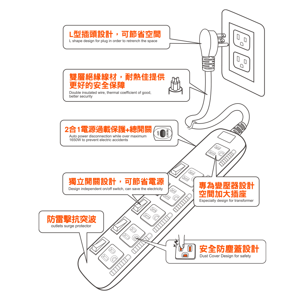 ‧ 防塵蓋可避免孩童觸摸插孔及防止灰塵進入