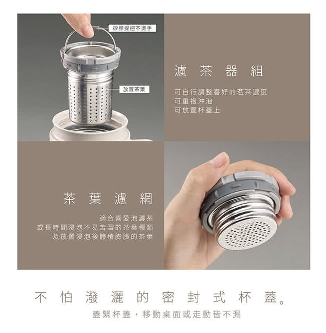 (1) 濾茶器組可按個人喜好濃度取出茶葉,並可重複沖泡,亦可放置於杯蓋。