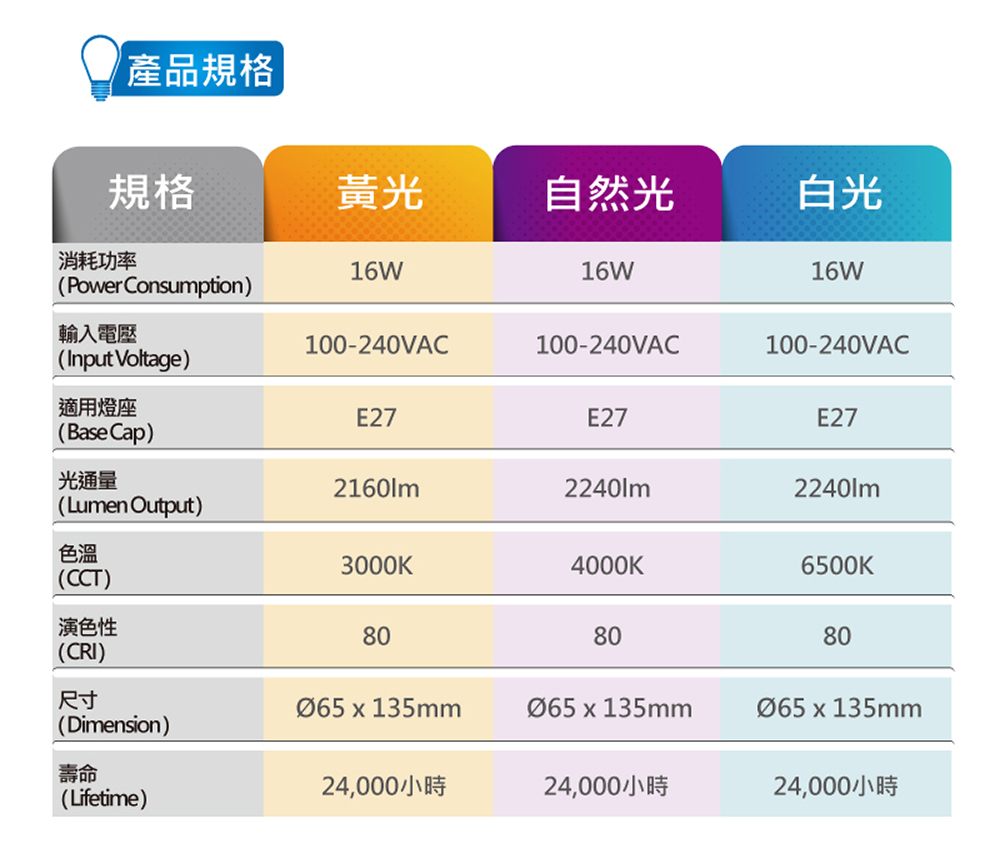 類型 白光 / 晝光 中性光 / 自然光 黃光 / 暖光