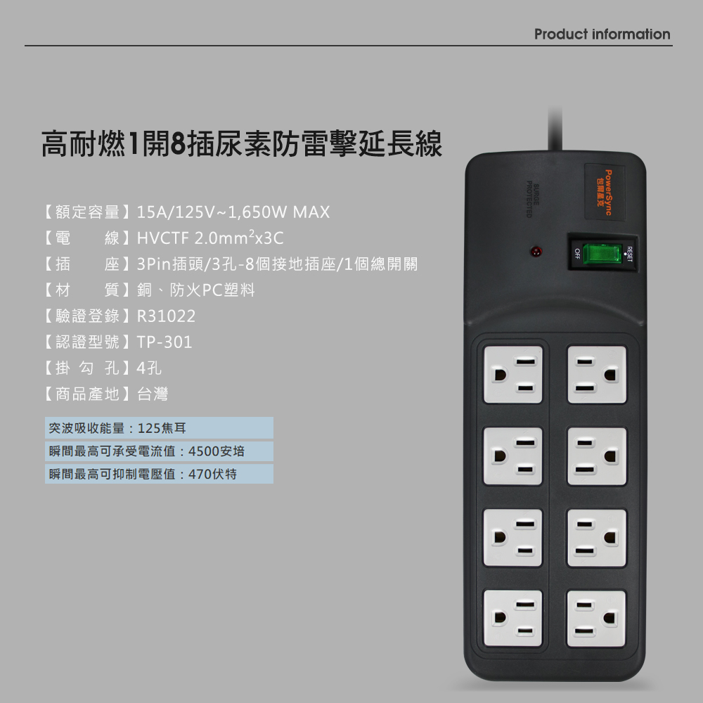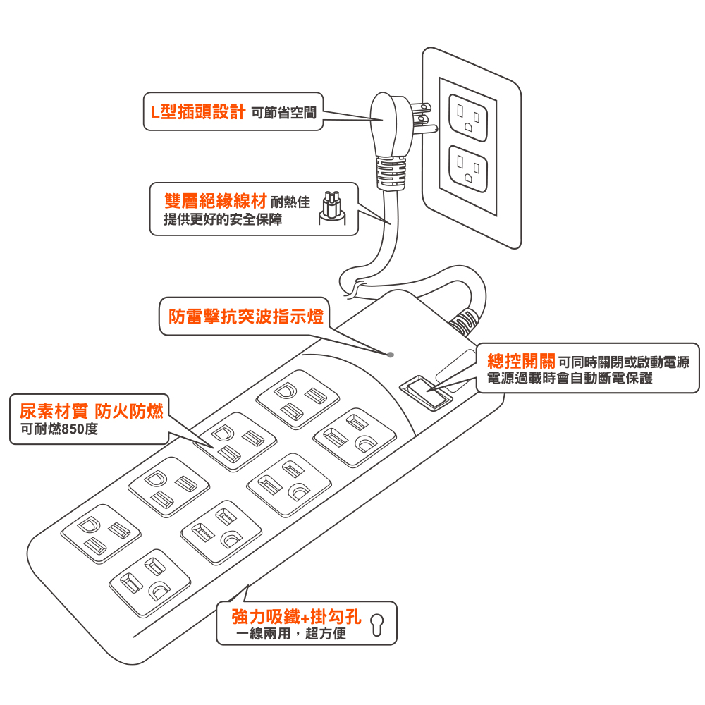 ● 品名:1開8插尿素安全防雷擊延長線(磁鐵固定)