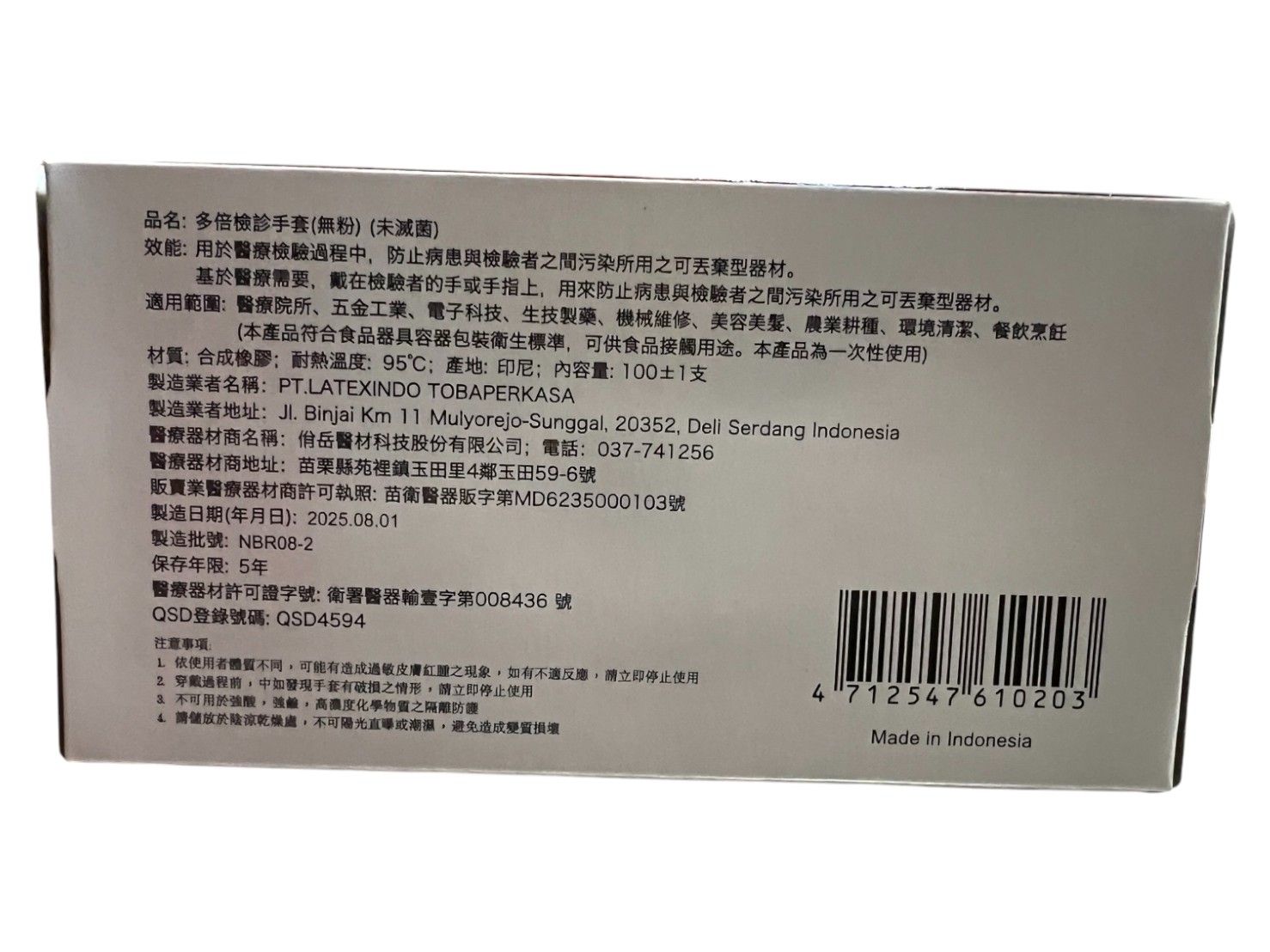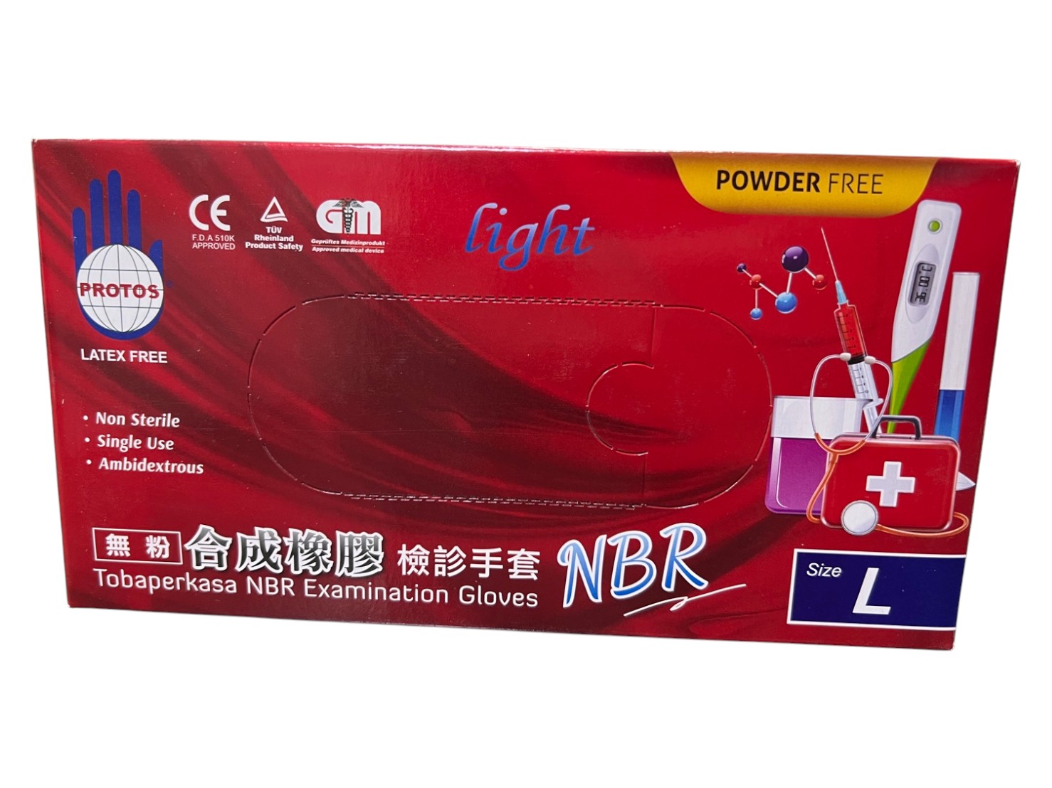 使用NBR丁?橡膠為合成橡,  不含天然乳膠蛋白, 抗油、耐溶劑與抗穿刺性上通常優於天然乳膠與 PVC。