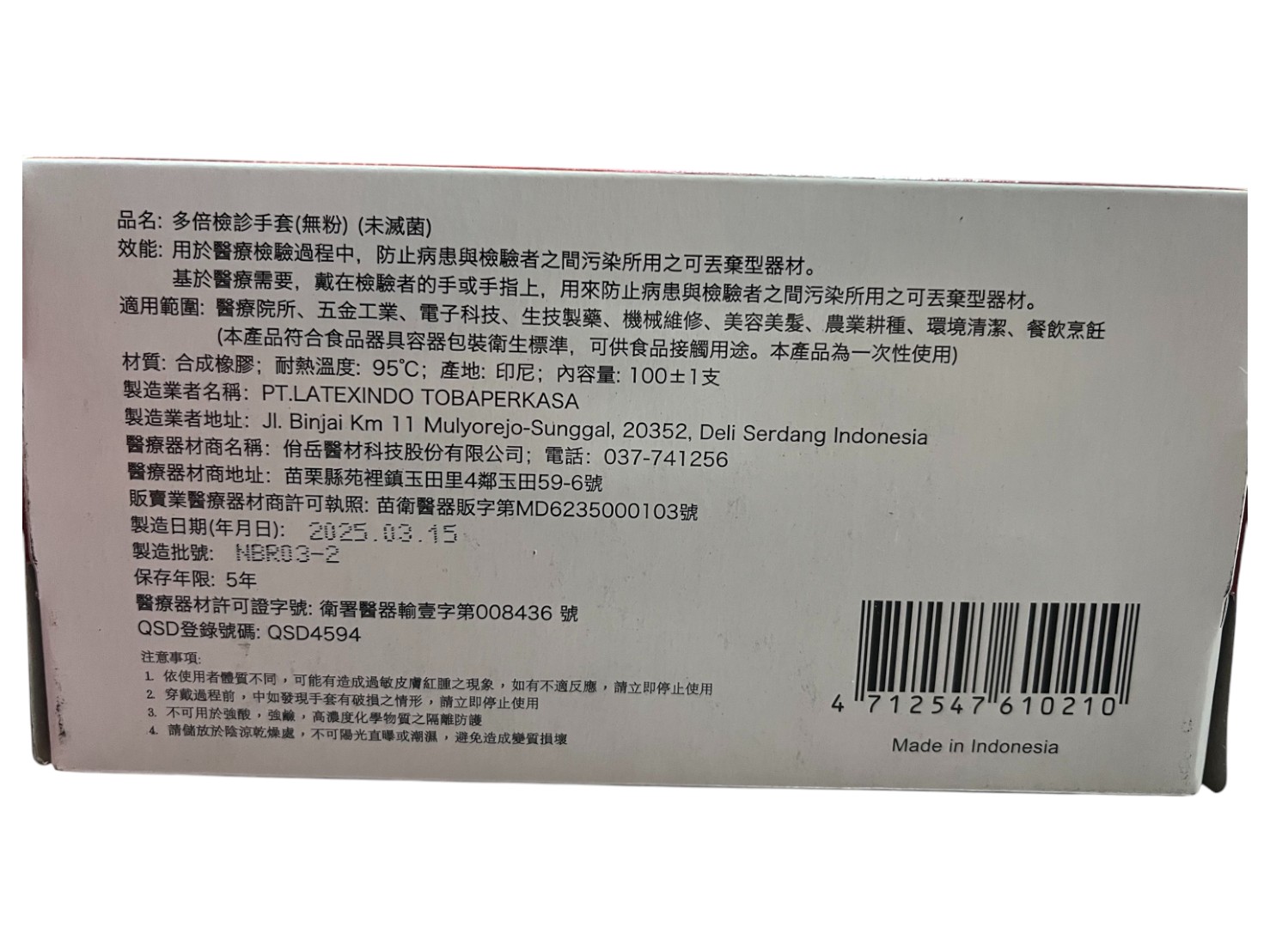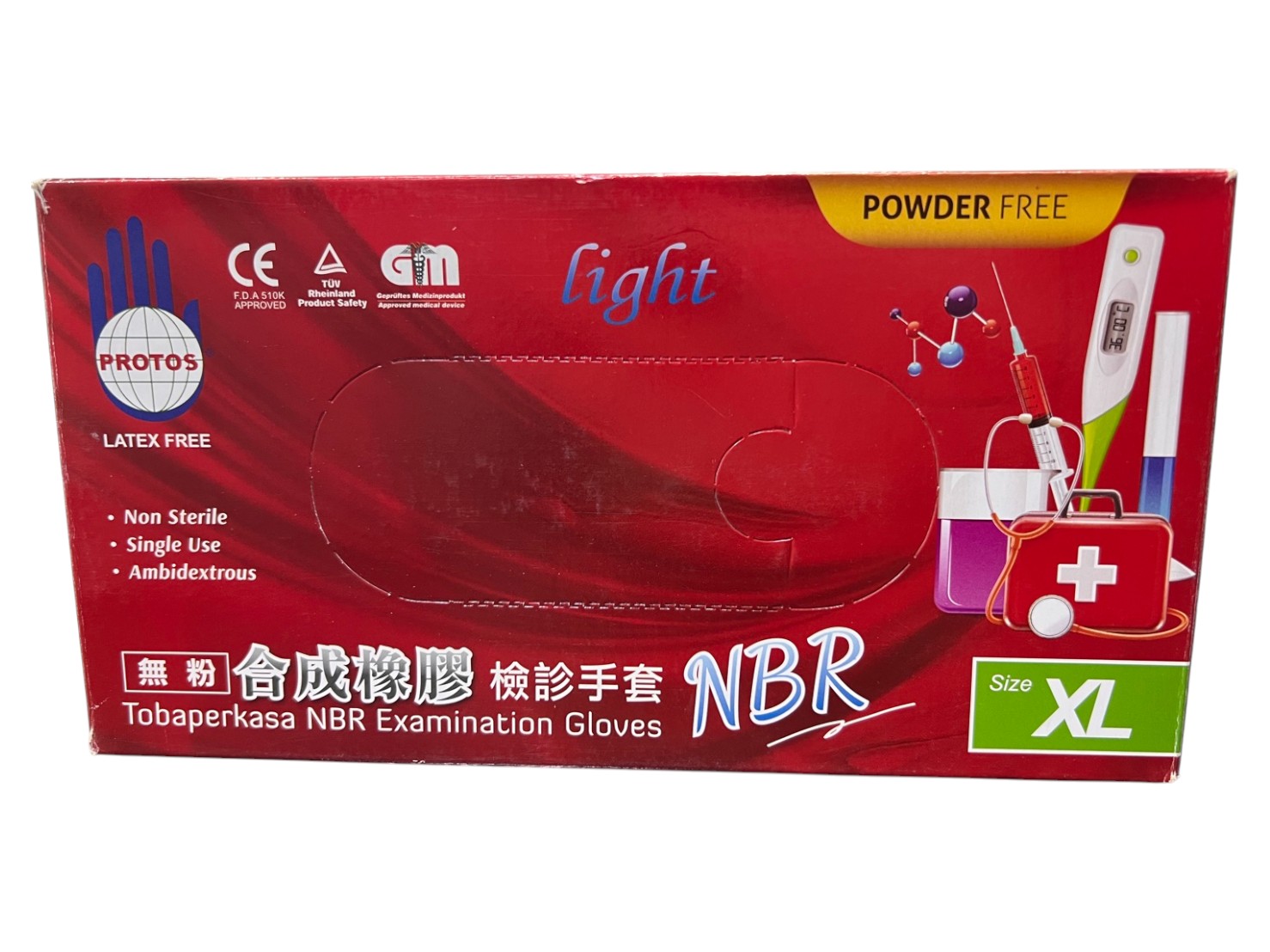 使用NBR丁?橡膠為合成橡,  不含天然乳膠蛋白, 抗油、耐溶劑與抗穿刺性上通常優於天然乳膠與 PVC。