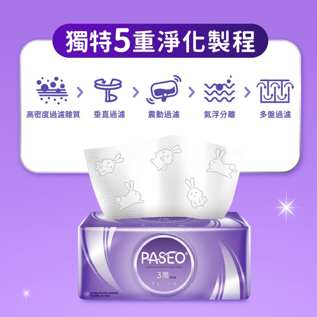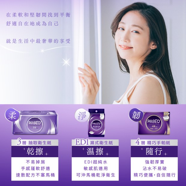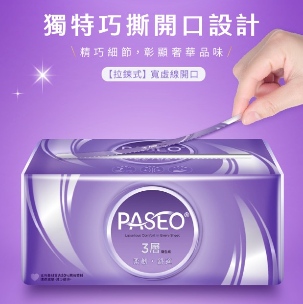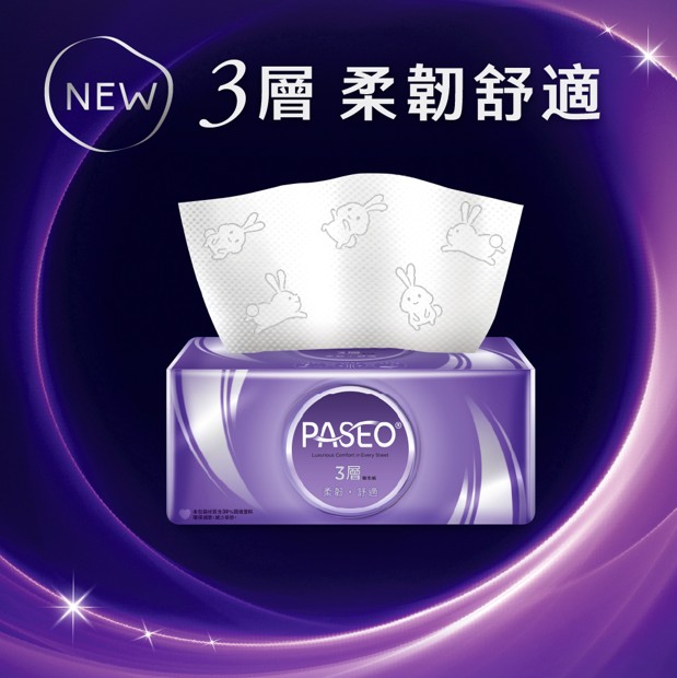 品名:PASEO 3層柔韌舒適抽取衛生紙100抽/T160PA-T3-PE/6包/12袋/箱