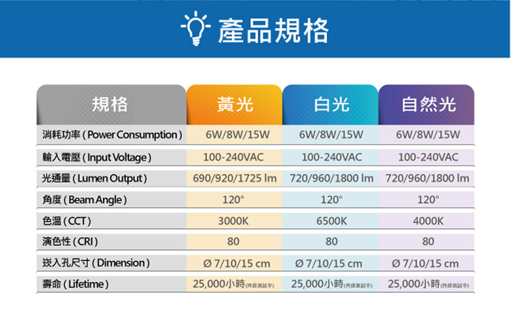 類型 白光 / 晝光 中性光 / 自然光 黃光 / 暖光