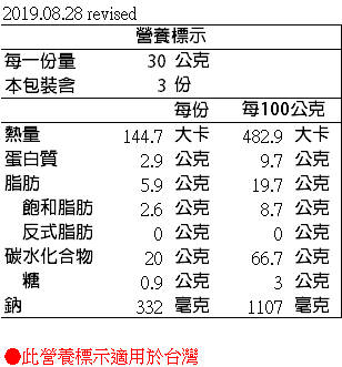 成 份 : 小麥粉,植物油(棕櫚油),樹薯粉,馬鈴薯片,洋蔥粉,大蒜粉,醬油[水,鹽,大豆,小麥,糖,L-麩酸鈉,5'-鳥嘌呤核?磷酸二鈉,5'-次黃嘌呤核?磷酸二鈉,