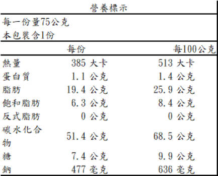 成份:樹薯粉,玄米油,蝦肉,棕櫚油,小麥粉,糖,鹽,洋蔥粉,麥芽糊精,大蒜粉,脫脂大豆,檸檬酸,酵母萃取物,碳酸鈉,阿拉伯膠,昆布,香菇粉,調味劑(5’-次黃嘌呤核?磷酸二鈉,5’-鳥嘌呤核?磷酸二鈉),甜味劑(甘草萃)
