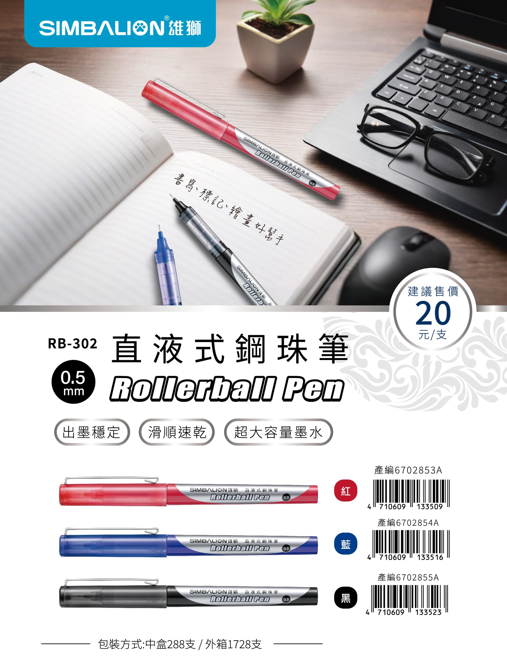 首頁 >  鋼珠筆/芯   > 雄獅SIMBALION直液式鋼珠筆/RB302/藍色/0.5mm