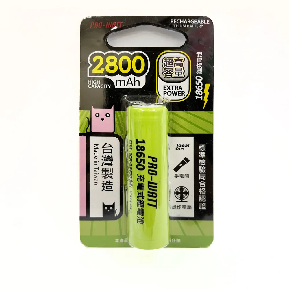 ◆品名:18650 鋰充電池 ◆型號:ICR-18650M ◆額定電壓:DC3.7V ◆額定電容量:2800mAh ◆材料:鋰電子電池 ◆尺寸:18mm*65mm ◆重量:50g ◆產地:台灣 ◆保存期限:5年 ◆BSMI字號:R64592