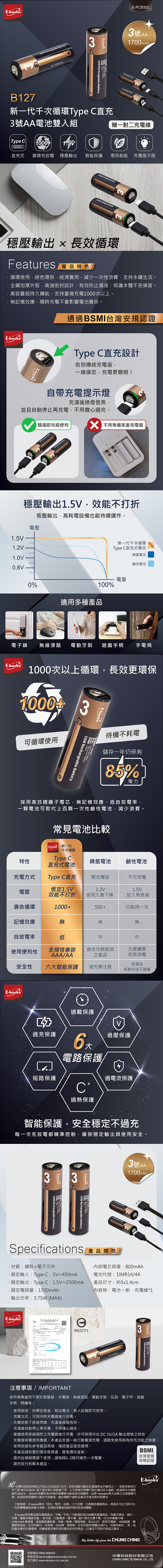 首頁 >  各類電池與周邊   > E-books Type C直充鋰電池/3號/B127/2入/贈充電線/組