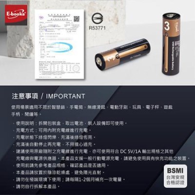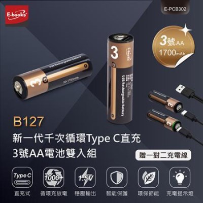 E-books Type C直充鋰電池/3號/B127/2入/贈充電線/組