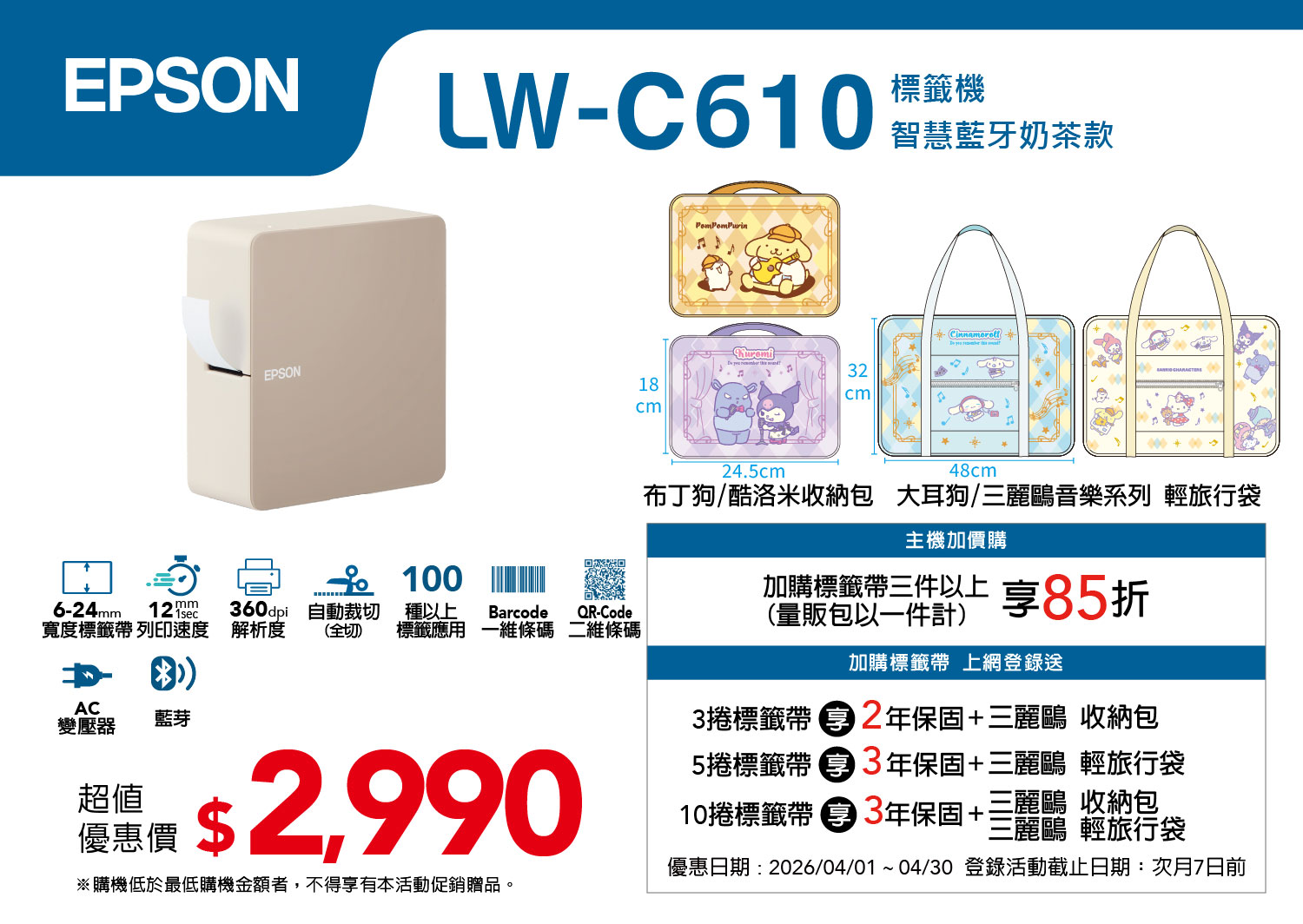 【滿額禮】凡購買『愛普生EPSON』標籤機(帶)全系列商品,單次單筆訂單滿$3000元,即贈 贈品:7-11 $100元禮券一張(恕不累送,數量有限,送完為止) ※(更多商品請上網選購) |