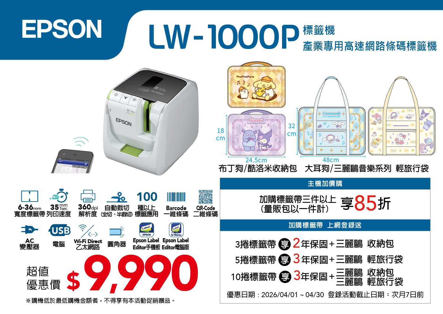 【滿額禮】凡購買『愛普生EPSON』標籤機(帶)全系列商品,單次單筆訂單滿$3000元,即贈 贈品:7-11 $100元禮券一張(恕不累送,數量有限,送完為止) ※(更多商品請上網選購) |