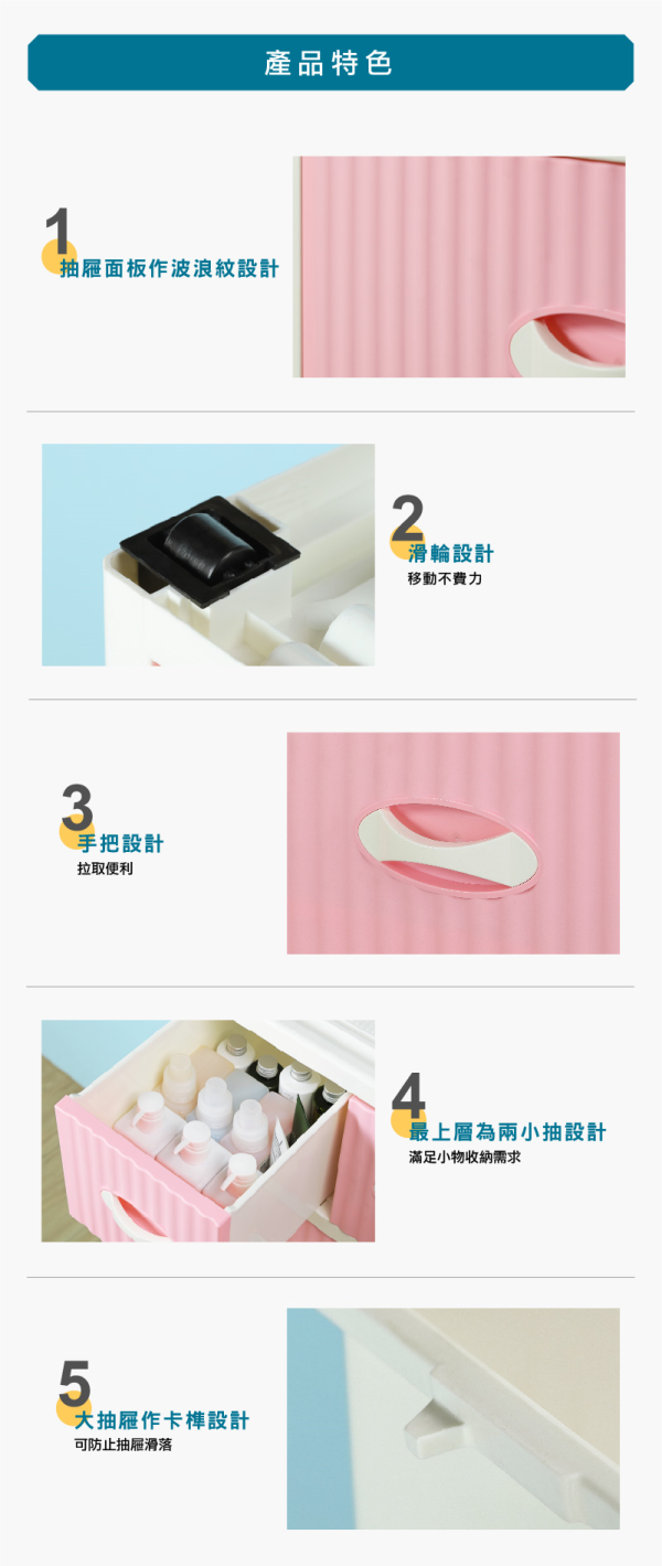 大抽屜作卡榫,可防止抽屜掉落;有四層、五層之產品,可供選擇。