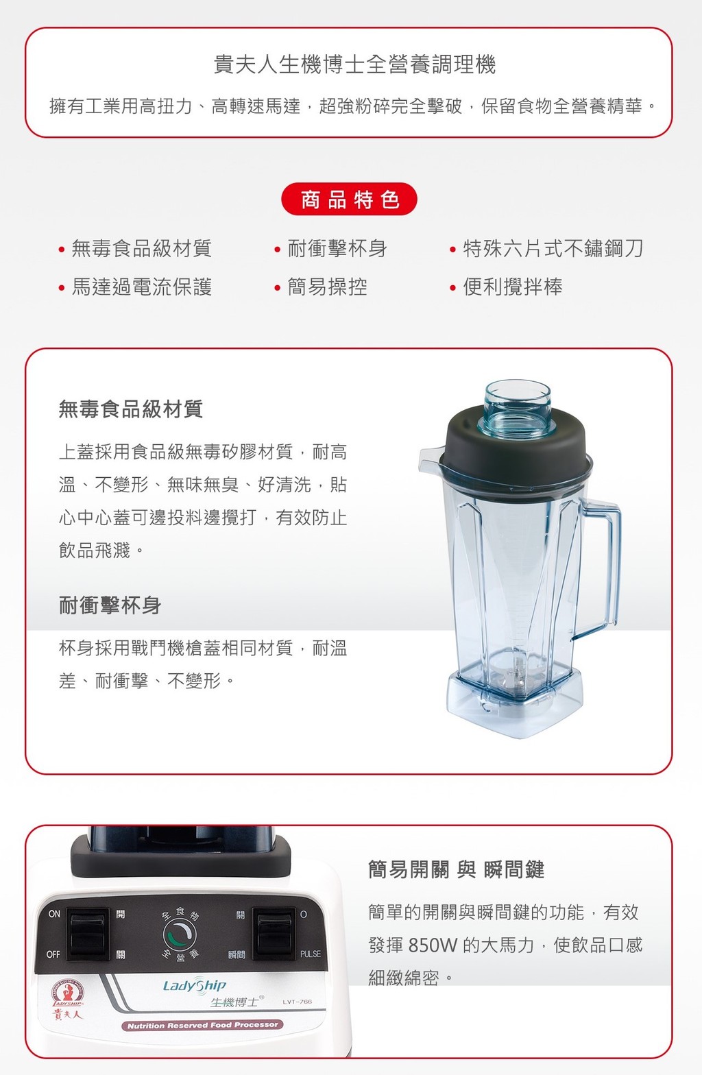 內含物件:主機/果汁杯/杯蓋/中心蓋/攪拌棒/生機飲食食譜/說明書