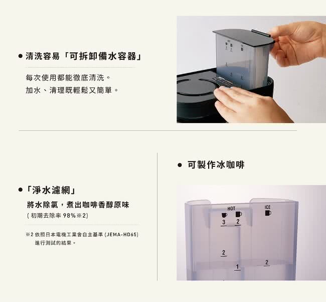 (2) 「淨水濾網」將水除氯,煮出咖啡香醇原味。