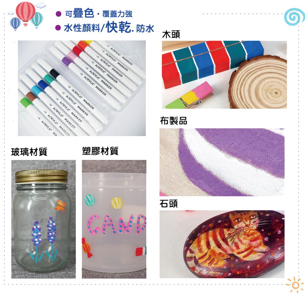 使用材質廣泛 如:石頭、帆布鞋(布類)、馬克杯、玻璃、紙張、塑膠、金屬、木頭...等