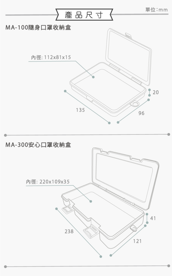 產品特色扣環式設計,闔蓋防塵;透色收納,看得見內裝物;隨身口罩盒(MA100)可收納一個口罩,隨身攜帶更便利;安心口罩收納盒(MA300)可收納10-15個口罩;可用酒精消毒,重複使用更環保,完整收納更安心。